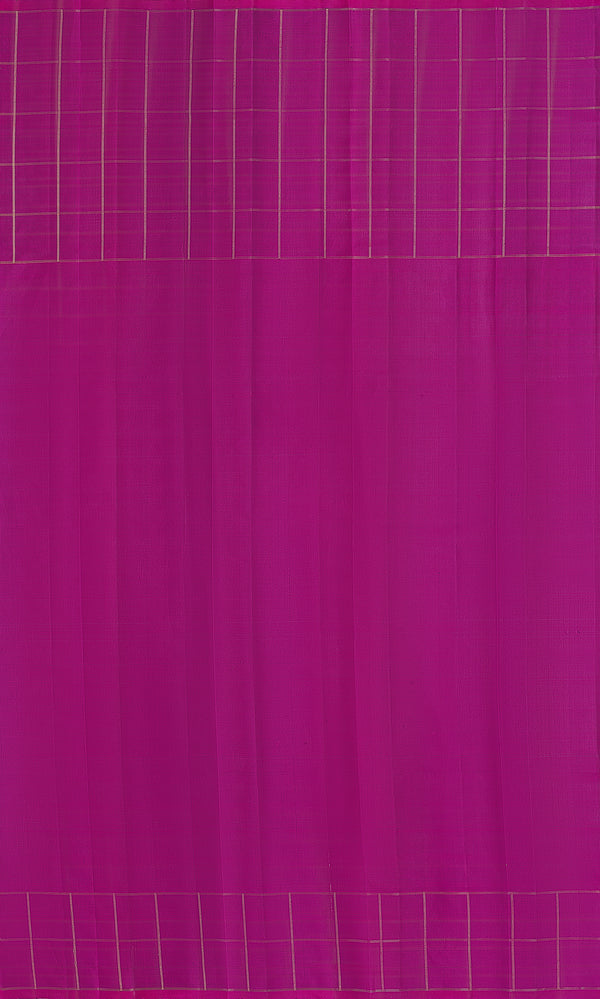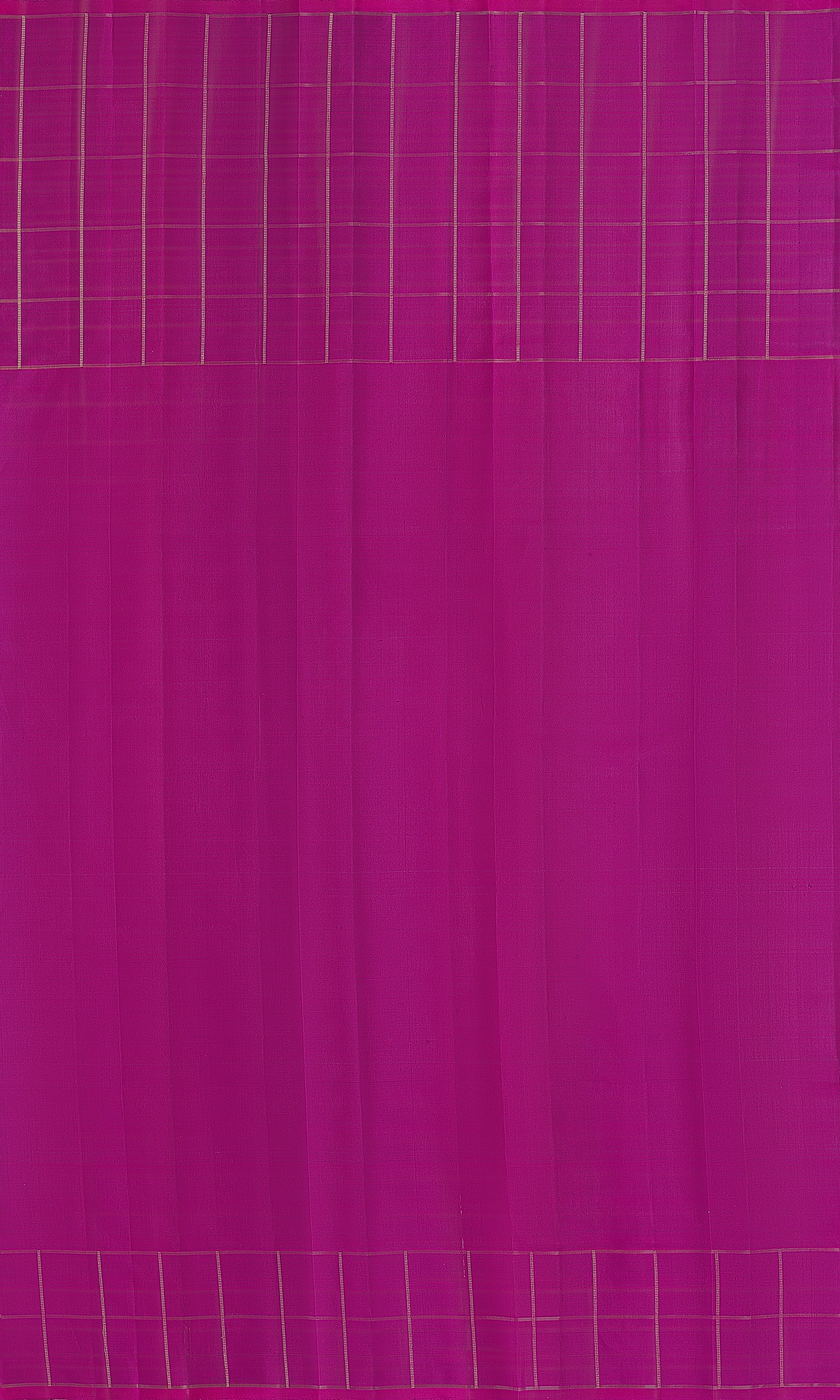Description: This luxurious handcrafted Kanjivaram silk saree features a serene dark green body adorned with delicate gold annam and chakram motifs in a uniform grid pattern. The saree is enhanced with striking dark magenta border featuring traditional gold zari work in a checkered pattern with Annam and chakram buttas. The elaborate pallu showcases intricate gold zari work with a leaf jaal pattern set against a dark magenta background.