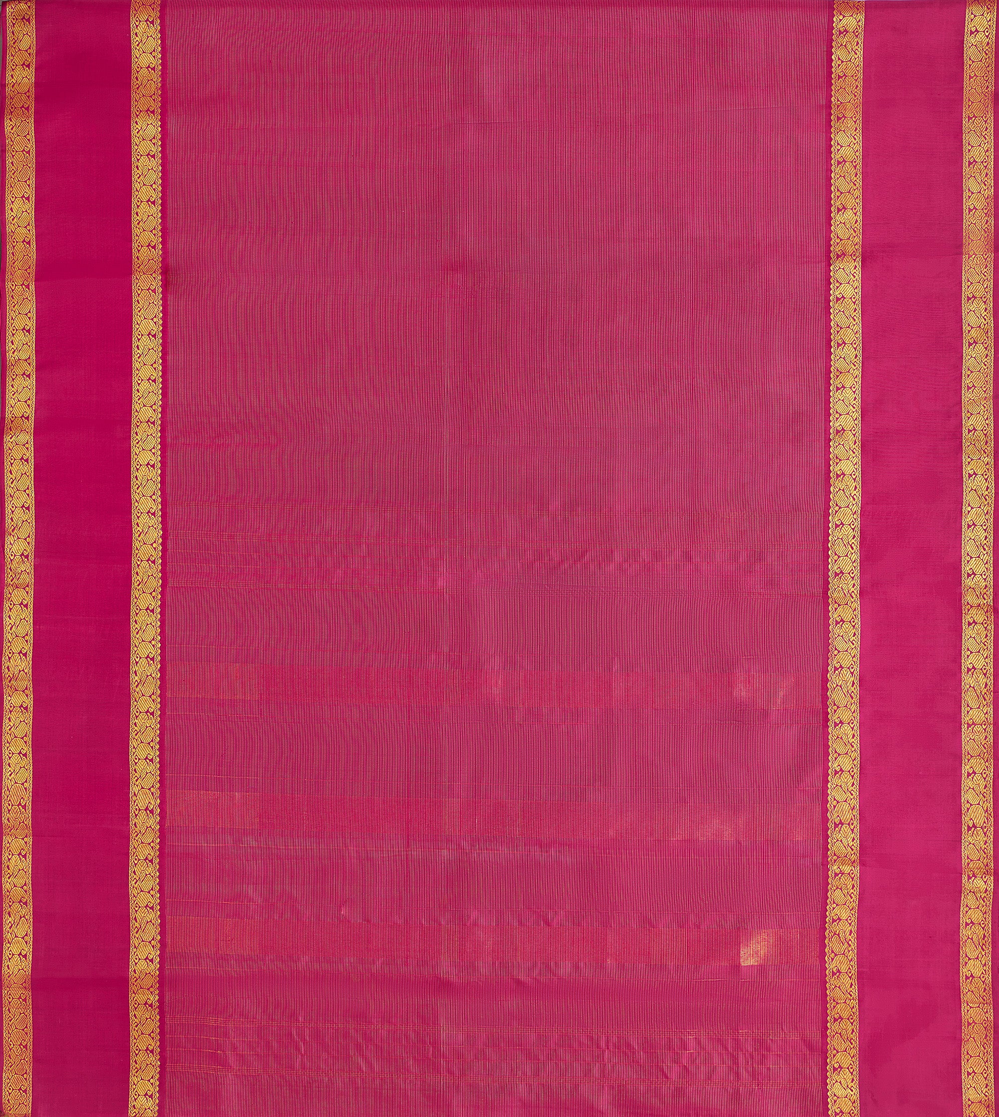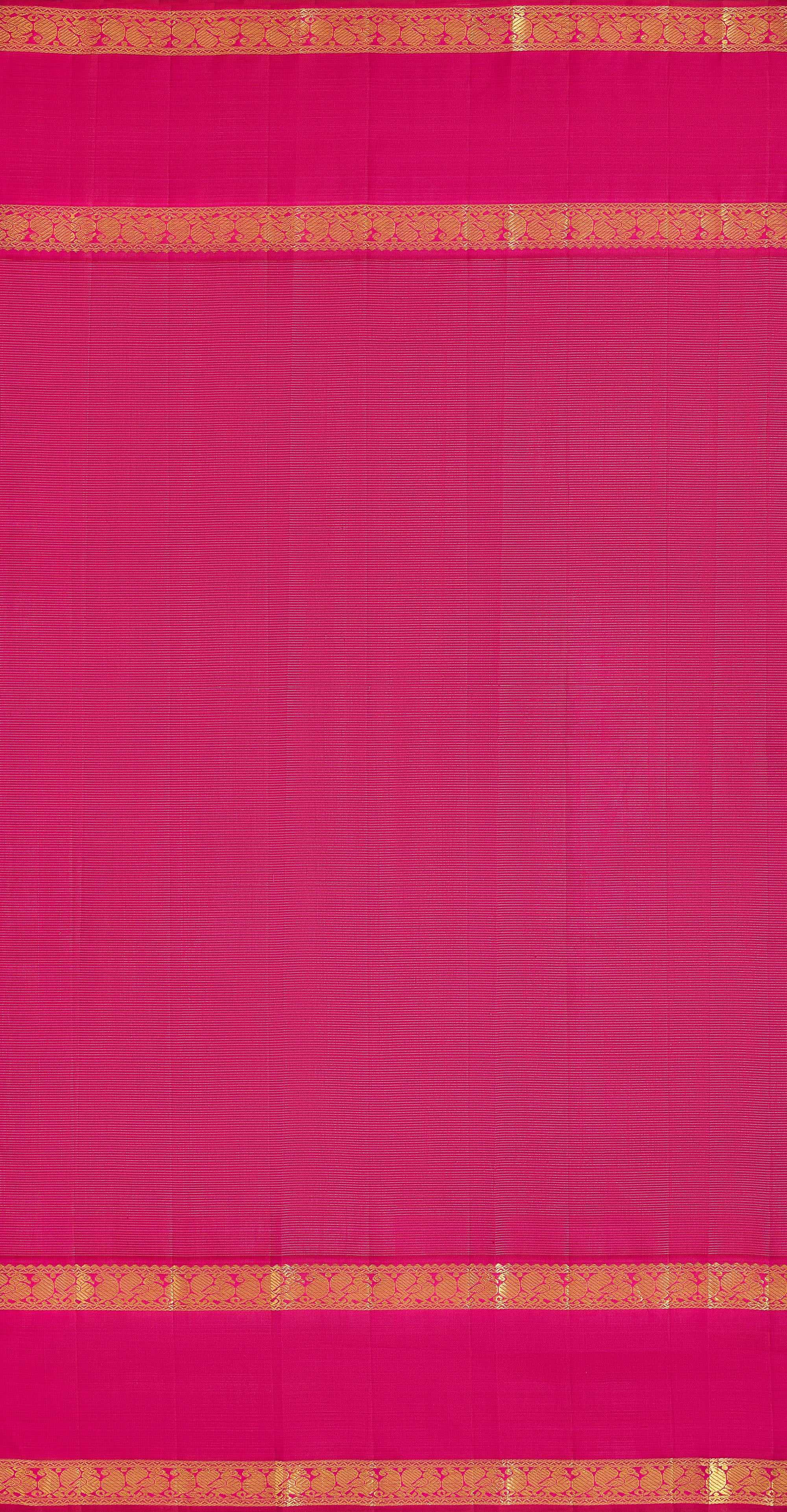 Description: This exquisite handwoven silk saree features a vibrant magenta body with delicate horizontal thread work creating subtle textural striping throughout. The saree is adorned with luxurious gold zari borders that showcase intricate traditional paisley and peacock motifs. The fine weaving technique demonstrates superior craftsmanships. The contrast between the rich magenta silk and the ornate golden borders creates a timeless elegance that embodies cultural heritage and sophistication. The pallu in the same colour as the body showcases alternating stripes in golden zari.
