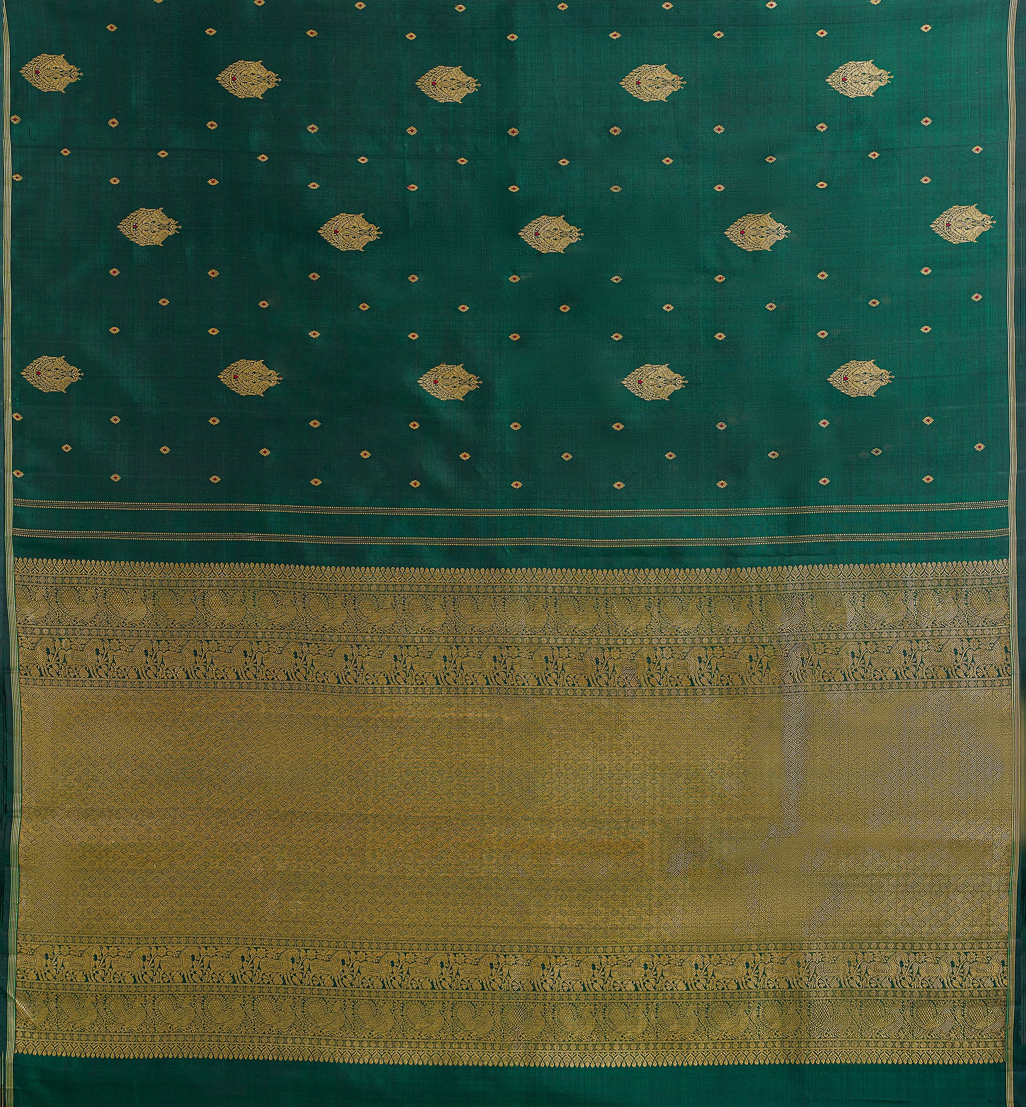 Description: This regal handwoven Kanchipuram pure silk saree in a majestic bottle green adorned with traditional gold zari work. This luxurious saree features ornate Iruthalai Pakshi motifs arranged in a meticulous pattern across the body, complemented by small floral accents. The opulent gold pallu displays intricate geometric patterns and a stunning horse and annam designs.